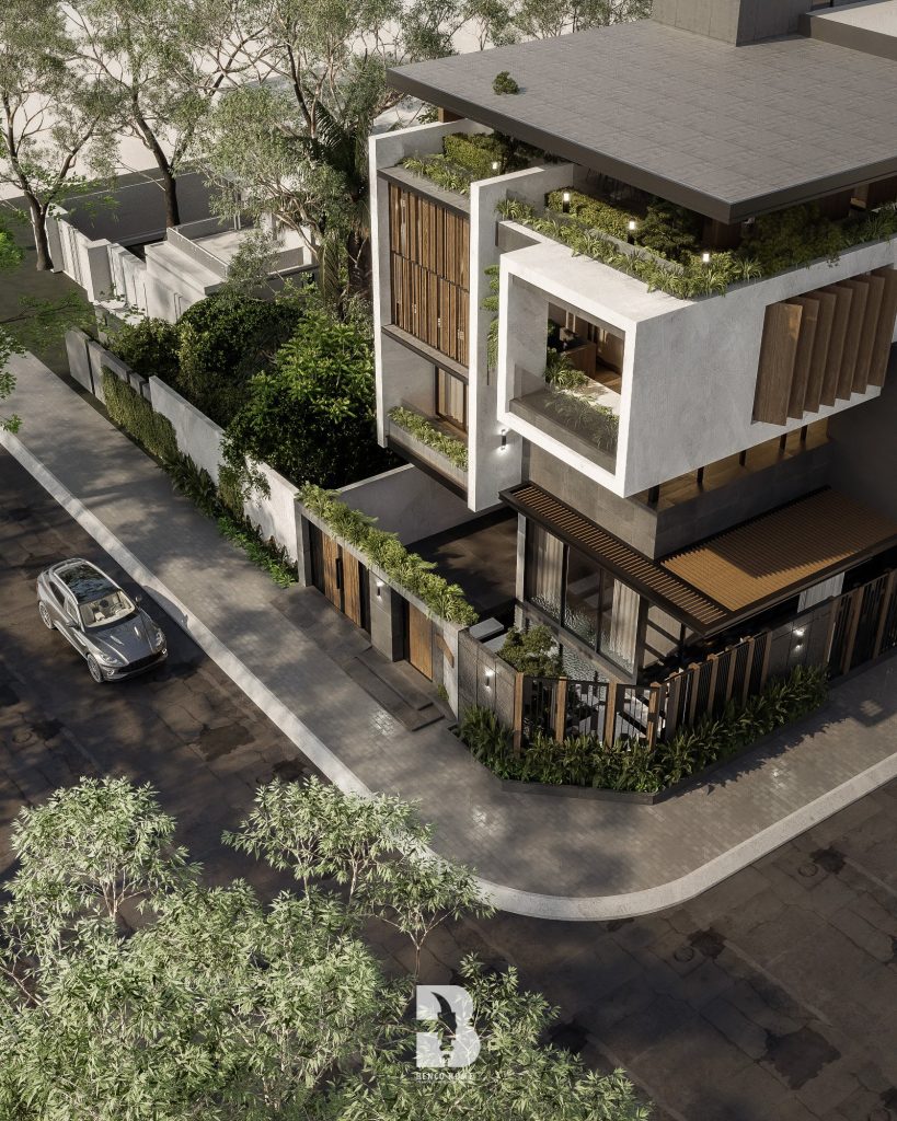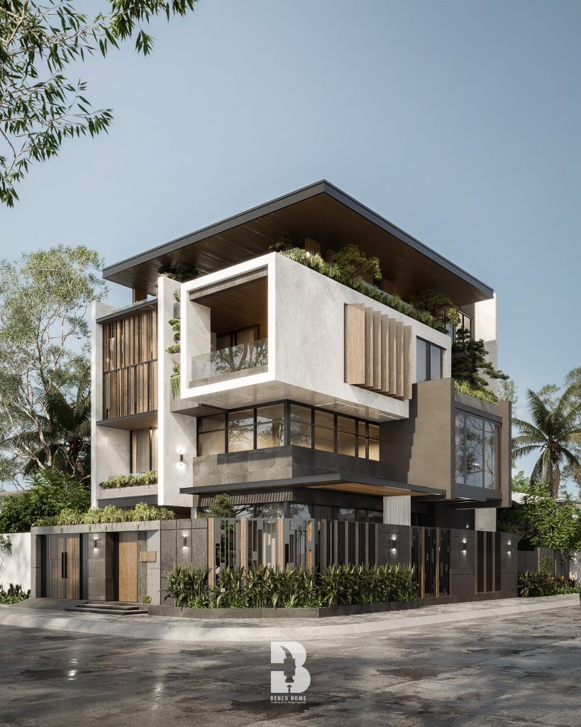 Ngay từ góc nhìn mặt tiền, công trình gây ấn tượng mạnh với bố cục kiến trúc mạch lạc, tỷ lệ hình khối vững vàng và ngôn ngữ thiết kế hiện đại đầy bản lĩnh. Các mảng đặc – rỗng được xử lý tinh tế, kết hợp cùng hệ lam gỗ, kính lớn, ban công rộng và mảng xanh đan xen, tạo nên một tổng thể vừa sang trọng, vừa giàu chiều sâu thị giác.